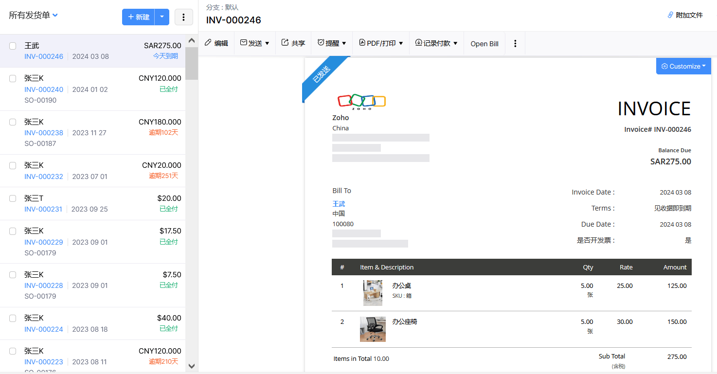 从账单生成到领取提示,从费用分类到财政报表从动生成,Zoho Books大大削减了人工操做的工做量和错误率。系统能够按照预设的模板从动生成专业的,并通过电子邮件及时发送给客户,简化了开票流程。