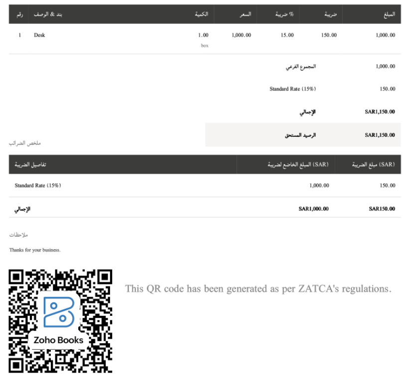 Zoho Books支撑处置分歧国度和地域的税收轨制,包罗报税表格、演讲和满脚各地税务要求的功能。这对于确保企业正在国际营业中的税务合规性至关主要。Zoho Books已被英国税务海关列为合适Making Tax Digital(MTD)兼容软件的申报。同时,Zoho Books仍是阿联酋 (FTA) 、沙特阿拉伯 (ZATCA)承认的合规处理方案。例如下图,产物至此生成合适沙特律例的电子。